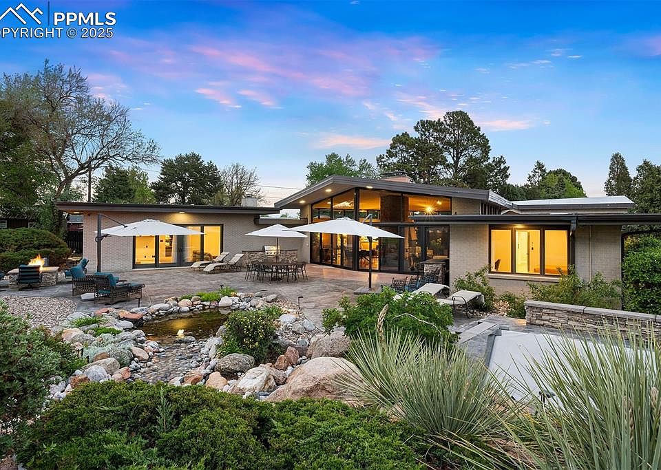 Welcome to a midcentury modern masterpiece. This unicorn of a home inspired by Frank Lloyd Wright is an architectural gem that seamlessly blends classic design with contemporary luxury. The relaxed circular drive brings you to the bold red front door. Enter into the awe-inspiring great room…featuring a soaring vaulted ceiling, gleaming Terrazzo flooring, dramatic freestanding red sandstone fireplace, and full wall of glass that frames views of Cheyenne Mountain. Outside you are greeted by an enormous 60' x 40' stamped concrete patio — complete with a built-in gas grill, waterfall, built in firepit and hot tub — abutting the lush green grass of the fully fenced backyard oasis…kept so green by your own irrigation well! The updated kitchen has heated flooring, sleek maple cabinetry, slab granite countertops, stainless steel appliances, and dual sinks. The light-filled vaulted recreation room boasts six skylights, beautiful new floors, and Saltillo tile accents — a true flex space. Retreat to the master suite, complete with 2-way fireplace plus a bonus office/study with wood sound-baffling accents. Along with the black marble 5-piece master bath there is a newly updated spa-like full bath and also a mid-mod inspired 3/4 bath featuring leathered tile wall and hex-tile shower. Three additional guest suites — each with private baths — offer comfort and privacy for visitors. Bathrooms also include smart toilets with remote control & bidets. A sun-drenched green room/solarium, spacious laundry and mudroom, and a powder room that pairs sleek modern lines with natural materials complete this home’s thoughtful design. Fantastic location close to The Broadmoor…and in the award-winning Cheyenne Mountain School District 12 (#1 in the state) — this one-of-a-kind home offers not just elegance and functionality, but a timeless design and luxury mountain lifestyle.