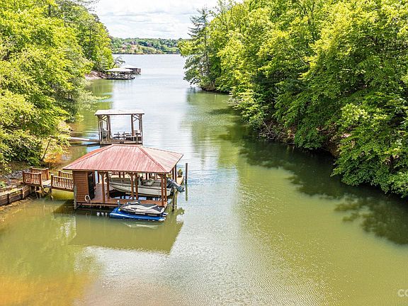 Beautiful one-owner home situated on a quiet Lake Hickory cove. This .8-acre lake lot is gently sloping w/a natural path to the lake w/no stairs. Upon arrival, you'll be greeted w/soothing water sounds coming from the pond/waterfall out front. Inside, you'll appreciate the floor plan of this well-built traditional home. Lg foyer w/marble tile floor w/spacious LR & DR on each side. Den w/gas log FP & access to lovely screen porch. Kitchen offers a dining area, granite c'tops, pantry & access to huge deck. Main level Laundry Rm. 2nd level offers a Primary BR suite w/WIC & private BA, plus 3 add'l BRs & full BA. Bsmt lvl has another Den/Rec Rm, Office, full BA & unfin area for workshop & storage. At the lake, there's a covered dock w/boat lift. 2020 & 2017 Heat Pumps. The flower garden & small white fence out front are on neighbor's property. A small portion of seller's driveway at the cul-de-sac may encroach on neighbor's property - seller having left property line surveyed to verify.