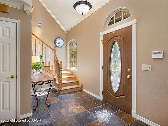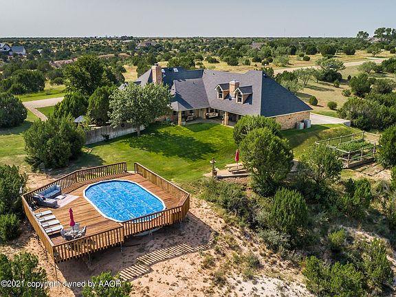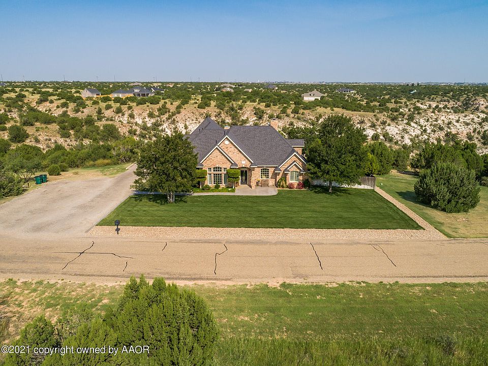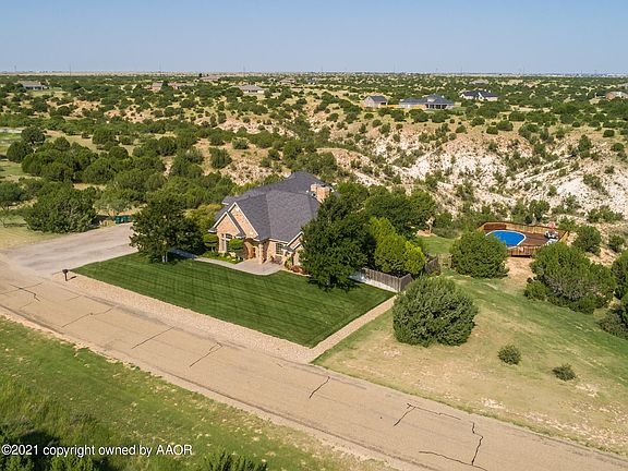 Looking for a little piece of Panhandle beauty & charm with Canyon views, then your search ends here! Peace & tranquility await as you watch the sunrise, night stars, and wildlife from this property. This fabulous home features 5 bedrooms; 3 on main floor, 2 upstairs, 3.5 bathrooms, 2 living areas, formal dining, skylights, slate flooring, upstairs office nook, and wet bar in 2nd living area, Isolated owners' bedroom & bath w/ separate jetted tub & shower. Oversized 3 car garage w/cabinets & stairs to the second floor. Covered back patio with wood burning fireplace. Above ground pool with wrap around deck. Wonderful landscaping and trees give this home great curb appeal. QUALITY Construction. Secluded, Quiet, with Breathtaking VIEWS from many Rooms!