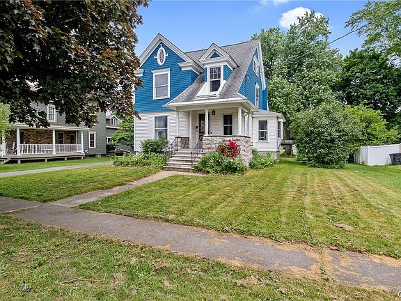 This historic colonial in the village of Canastota combines both the character and charm of an old home with many recent updates for modern living. Step inside to the entry foyer which showcases a beautiful handmade staircase with ornate natural woodwork and original newel post lamp. French doors open to the living room with original wide plank flooring and extra-large windows. A separate sitting room with fireplace and built-ins is the perfect cozy spot to relax with your favorite book! Other features include a spacious formal dining room with picture windows, enclosed rear porch, first floor half bath, and three bedrooms plus full bath on the 2nd floor. There is no shortage of additional storage space, with a walk-up attic, full basement, and detached 2-car garage with 2nd story loft. Many recent updates include new electrical service and panel with 200 Amp service, new water heater, rebuilt front porch, and exterior painting. This home was built by local builder-contractor Joseph Skelton in the mid-1800s and is set on a large lot with plenty of flat, open yard space. Truly a unique property, schedule your showing today!