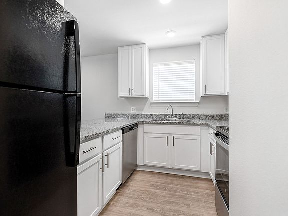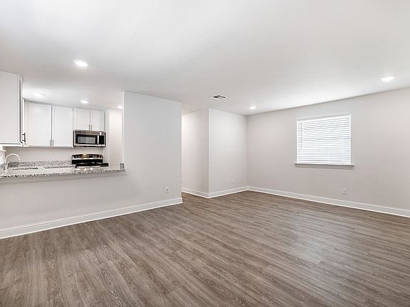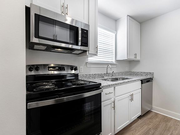 Recessed lighting and large windows with faux-wood blinds illuminate the space in natural light. Wood-tone flooring flows throughout complemented by ample closet space with custom built-in wood shelving. Kitchens include granite countertops, multi-use kitchen islands, brand new appliances, and updated cabinetry. Built-in microwaves are available in select homes. Each home features ceiling fans, dimmable lights, and in-home washers and dryers.