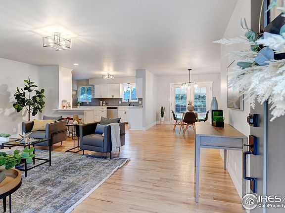 Charming and fully renovated home in popular mid-town Fort Collins! Seller has breathed new life into their childhood home will all new interiors and many exterior improvements. Open concept, main-floor living and striking solid wood floors in living areas. Gorgeous, expanded kitchen with solid wood cabinets, quartz counters with counter seating, and upgraded stainless appliances. Both bathrooms are all new, with cool, modern tilework, new vanities, fixtures, etc. Light, bright and clean with new paint, trim, and lighting throughout. French doors lead to the large, fenced yard, and covered back patio. Don't miss the adorable "bunkhouse" with many potential uses: studio? playhouse? yoga room? The two-car garage boasts a surprisingly nice and large storage closet and there is additional storage in the shed. Must see to appreciate how this house lives "large" in a small footprint; see additional property remarks to see all 2023 improvements. No HOA or metrodistrict! Conveniently located in walking distance to restaurants, groceries, shopping, and the Max Transit station.