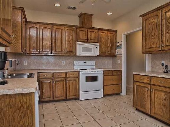 Beautiful white limestone Danek built home with covered porches front and back. The MIL plan features many upgrades such as berber carpet, ceramic tile and built ins. An open floorplan with adjacent living, dining and kitchen areas make a great place for entertaining family and friends. The master suite includes a large master bath with double vanity, garden tub and shower and a huge closet!! Garage is oversized and finished out. Exterior is all masonry with RV pad , fenced back yard and sto
