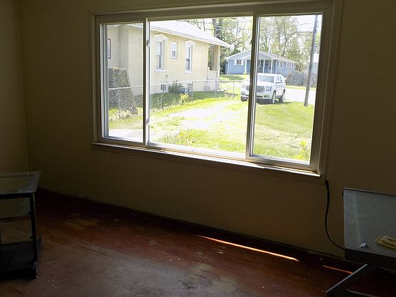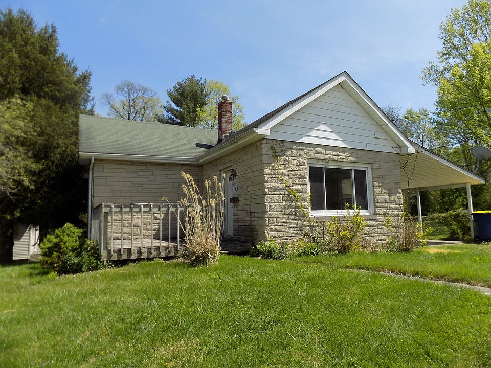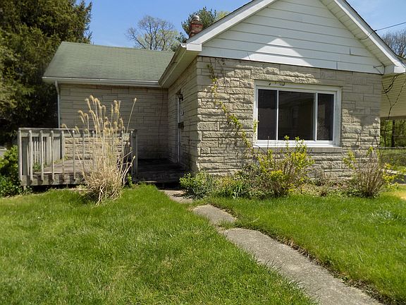 This two-bedroom house features a classic Bedford stone & aluminum exterior. The main entrance opens into a welcoming living room with hardwood floors that show potential but are dulled by years of use. The kitchen retains a vintage charm but requires modernization and appliances. Overall the house, while structurally sound, requires some interior repairs and updates to restore its charm and functionality, making it a potential gem for someone willing to invest in renovations.