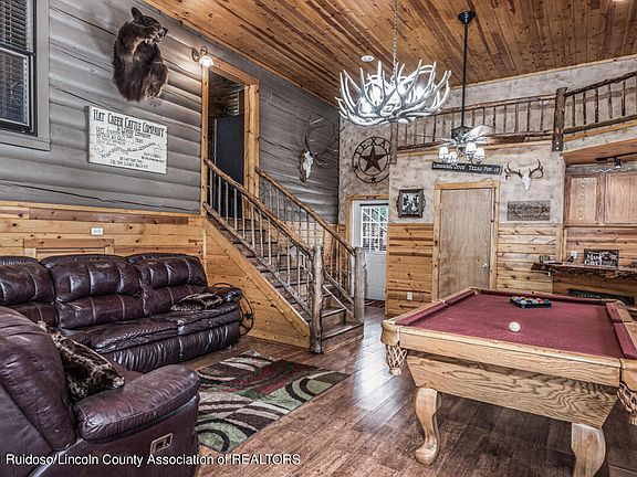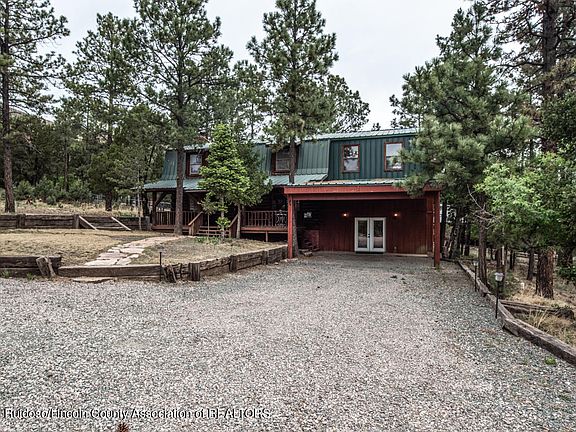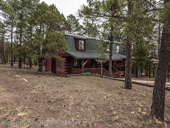 LOG HOME in the cool pines with 5 bedrooms, 3.5 baths, game room with pool table, 2 bars, 3 fireplaces, covered front porch, hot tub, carport, circular drive, strong nightly rental revenue (sleeps 15+), Fully Furnished, wooded level lot. Huge Master bedroom has a sitting area and a fireplace for a cozy night, one bedroom has a balcony for morning coffee/evening wine, western decor. Make this your dream mountain home or investment home. Excellent Rental History!!!