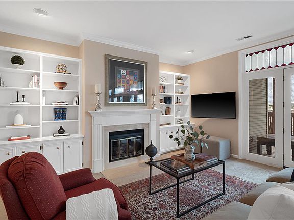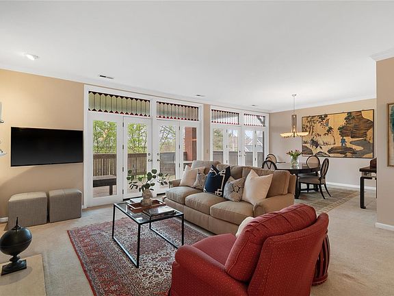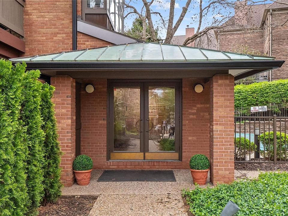 Welcome to the highly sought-after Kingsbury Place! This Old Town Clayton condo offers the perfect blend of luxury and convenience while just a short walk to all the shops and restaurants that make this neighborhood a gem. A secure entrance and elevator further lend to a lifestyle of ease and sophistication. Inside are 9' ceilings, beautiful millwork, and stained glass accents. The floor plan unveils a spacious living area boasting built-in bookshelves and a gas fireplace that seamlessly transitions into the dining room. The eat-in kitchen has ample cabinet space, while the den features glass French doors. Highlighted by a large bay window, the primary suite provides an updated bathroom with marble counters, a jetted tub, and an elegant dressing table. Additionally, there is a second bedroom, in-unit laundry, and a wall of glass that leads to the spacious covered deck. Outside, the common grounds showcase a pool and lush gardens. Two parking spots. Electric car charger-friendly. Location: Corner Location, Upper Level