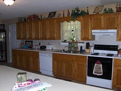 3 bedroom 2 bath house on 1 acre in quiet subdivision just outside of town has large kitchen with lots of cabinet space.