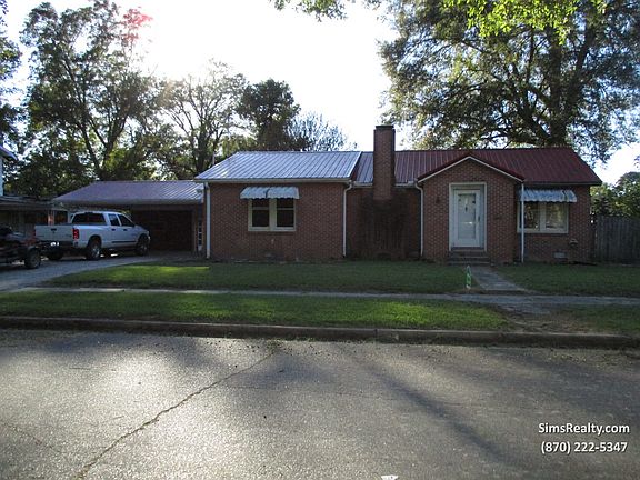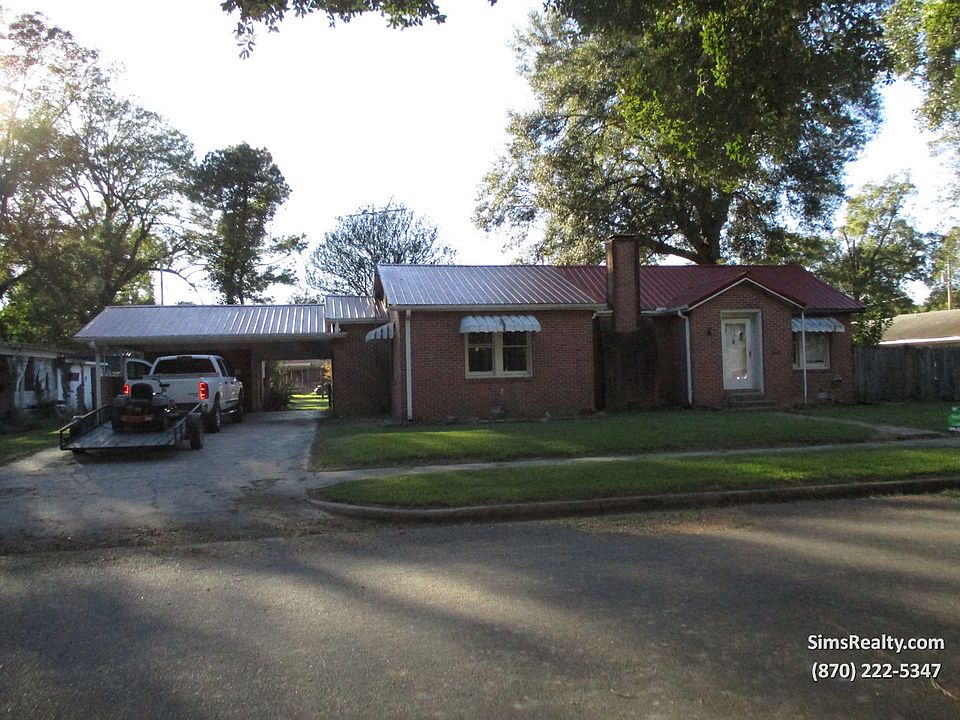 This is a 4 bedroom and 2 bathroom house with the fourth bedroom on the back of the double carport. If you don't need a fourth bedroom, then it could also be used as an office or even a man cave. It has a drive-thru, under the large double carport, to get to the nice backyard. There is a covered patio for cooking out. The red metal roof is four years old. The hardwood floors are in the living and dining area, the two largest bedrooms and the hall. It also has a large utility room. The range for the kitchen will be installed at closing. It has a nice double carport.