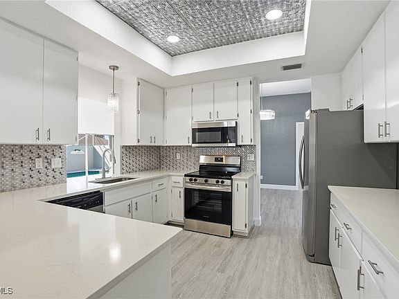 An indoor laundry room with quartz counters and storage cabinetry keeps daily tasks organized. The screened in-ground pool area offers exceptional privacy and a sleek backdrop for outdoor lounging. The fenced yard is ideal for children or pets. Major upgrades include a new roof, new AC, new flooring, new paint inside and out, new kitchen, new bathrooms, new lighting, new fixtures, new garage door, and more. Not located in a flood zone — no flood insurance required.