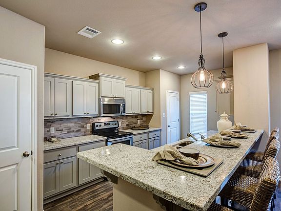 Luxury vinyl plank floorsHuge windowsCovered patioStone and stucco exteriorPrivacy fenced grass backyardBeautiful cabinetryTrim work