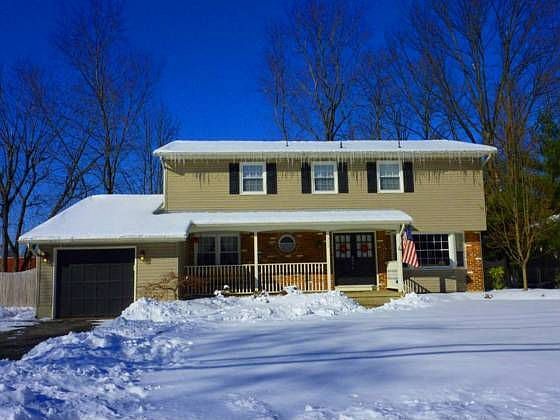 Large 4 bedroom updated colonial with front porch and swing. Updated kitchen and baths. Family room off kitchen. Entry foyer with ceramic tile flooring and half bath. Large living room and dining room with oak hardwood floors. Sliders of living room lead to a large deck partially covered perfect for entertaining. Finished basement is also perfect for entertaining w/large media area & oak bar. Four generous sized bedrooms are enhanced by 2 updated bathrooms w/ ceramic tile flooring & newer cabinets and fixtures. Hardwood flooring throughout upstairs. Nice combination of black and newer tan vinyl siding w/ brick on the front porch. Rear yard is fenced with a tall privacy fence. Small shed in rear yard for outdoor equipment. 1 car garage with pull down stairs to floored loft area.First floor laundry room off garage and kitchen with side entrance makes for the perfect mud room. If you want space & finished basement this home has over 2500 square foot of living space & is priced the best for a quick sale!