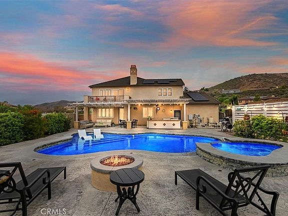 Your Dream Norco Hills Estate with Mountain Views, Pool, and Endless Upgrades! Welcome to your stunning Norco Hills cul-de-sac home, offering mountain views and luxurious outdoor living on over half an acre! This 5-bedroom, 3-bathroom pool home has been thoughtfully upgraded throughout and is ready for you to move right in. As you arrive, relax on the charming front porch and watch the horses go by this is Norco living! Step inside to soaring ceilings and custom touches, including crown molding, plantation shutters, and gorgeous wood & slate flooring. The spacious formal dining room sets the tone with a darling chandelier and elegant finishes. The chef’s kitchen is a dream with granite counters & backsplash, stainless steel appliances (double ovens, microwave, dishwasher, trash compactor, and refrigerator), maple cabinetry, and a walk-in pantry. The kitchen opens seamlessly into the family room featuring built-in surround sound. Downstairs also offers a full bedroom and bath, perfect for guests or multigenerational living. Upstairs, retreat to the massive primary suite with two walk-in closets, a spa-like bathroom with soaking tub, and a private balcony showcasing the views. Three additional large bedrooms, a third full bathroom, a huge linen closet, and a built-in computer nook complete the upper level. This home is loaded with extras including a paid-off solar system, central vacuum, alarm system, and CAD-5 wiring. Step into your backyard oasis with a custom in-ground pool and spa, covered patio, built-in BBQ, ceiling fans, and custom lighting—perfect for entertaining or relaxing in style. The flat back area offers room for horses, RVs, or all your toys, with full RV hookups (30/50 amp, washout, and water), and two 10x10 sheds for additional storage.