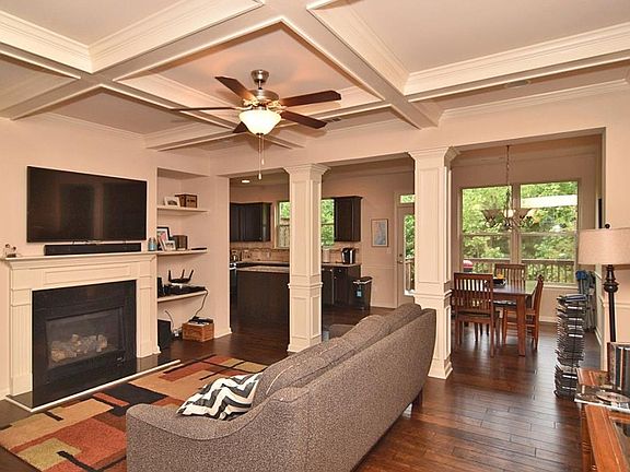 Upscale townhome near the Mall of GA in Buford w/ 2 car garage & tons of upgrades! Coffered ceiling in Family Room, Hardwood floors, Granite counters and Tile backsplash in Kitchen w/ upgraded SS appliances and much more. Finished basement level features huge 4th BR & Full Bath + large rec room or fam room. Back Deck overlooks Private wooded green space.