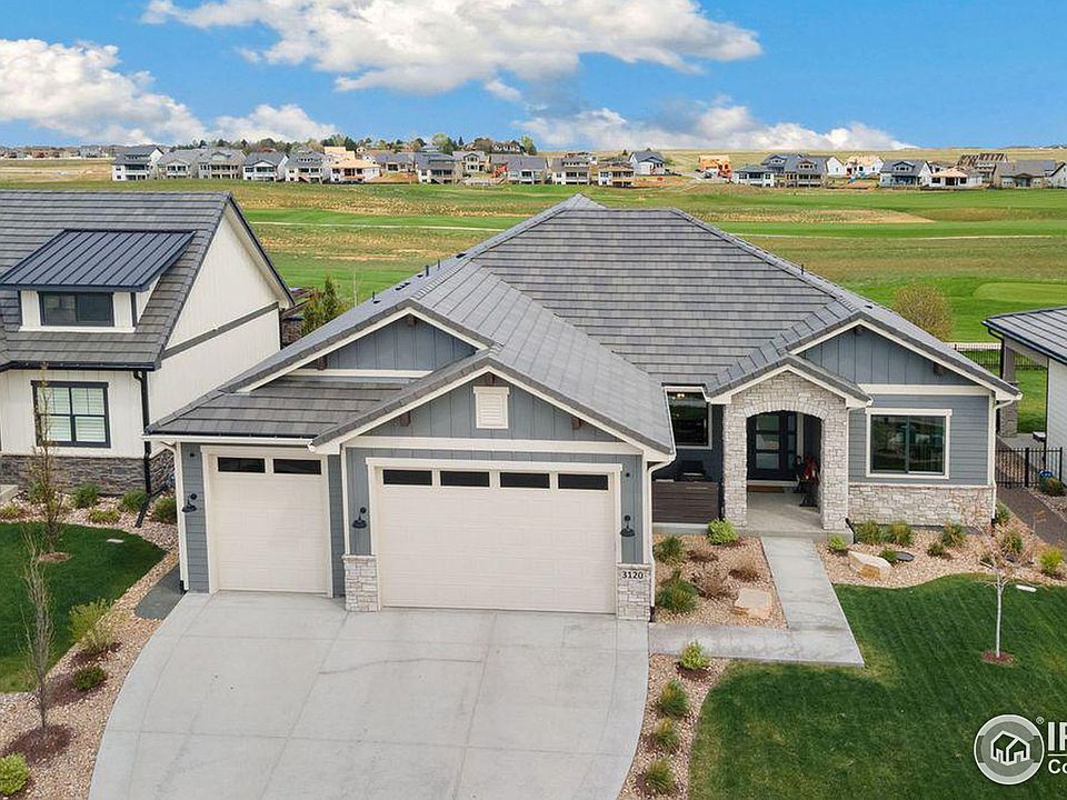 Perfect for a lock and leave lifestyle with all the benefits of a single family home, this luxury villa-style home in Heron Lakes at TPC Colorado offers minimal maintenance, designer finishes and backs to hole no. 12 at TPC Colorado. Featuring a main level primary suite, this home offers 5 bedrooms, 3.5 baths plus an additional study and almost 4,800 SF of living space. Interior design features an open floorplan with engineered hardwood flooring through main level living spaces, vaulted ceilings, upgraded lighting fixtures, great room floor to ceiling gas fireplace feature and functional touches throughout. The gourmet kitchen has quartz and slab granite counters, amongst a massive kitchen island, double ovens and a gas range, a full suite of stainless-steel appliances, off-kitchen dining and walk-in pantry. Large primary suite with a walk-in closet and 5-piece luxury bath with a standing white tub. Two additional bedrooms on the main level and the large laundry room with a tub and counter/cabinet space. You enter the basement into the large family room with a massive wet bar for entertaining. The final two bedrooms sit in the basement along with the formal study and large unfinished storage/utility space. The backyard offers a 17 x 15 covered patio with privacy paneling installed with electrical for a hot tub. Extended front cement on the front patio and full property professional landscaping. Oversized 3 car garage with 10 ft doors, Tesla charging station. Homeowners in Heron Lakes have access to community amenities of a resort-style pool (additional being built now), fitness center with full programming, two community restaurants (3rd under construction), a 6,500 SF clubhouse, 8,7 miles of maintained trails, discounted membership the community Lake Club and more. Central Northern Colorado location half-way between Denver and Fort Collins.