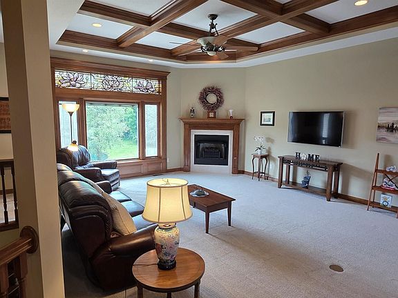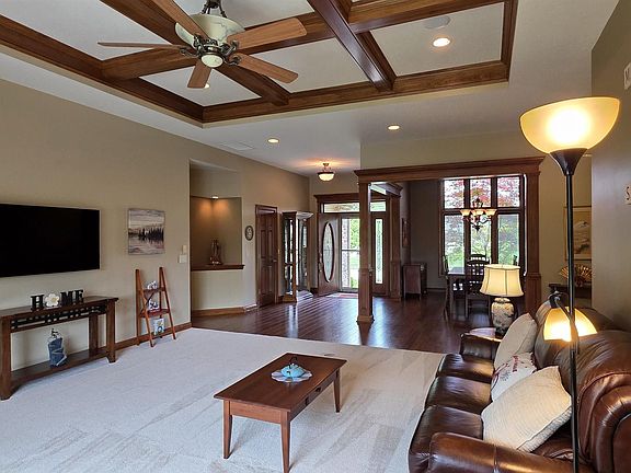 MOVE-IN READY, gorgeous, Quality Crafted ranch on finished walk-out basement located on waterfront lot in desired Canyons of North Pointe Woods! This home oozes CHARACTER & CHARM. Main floor foyer is beautiful, open w/ sweeping views of great room w/coffered ceiling & stained glass window that overlooks the scenic pond. Formal dining room is set & ready for the next dinner party. The GRAND kitchen boasts granite countertops, walk-in pantry, stunning woodwork & lovely backsplash. ALL STAINLESS STEEL APPLIANCES stay. Small office space off the kitchen is super convenient. Let's talk about the 4-CAR garage that offers EVEN MORE SPACE for cars, toys, etc! Primary main-floor ensuite is generously sized & includes a wonderful bathroom w/dual sink vanity, jetted tub & separate tiled shower & HUGE walk-in closet. Large walkout finished basement features a family room w/ custom wet bar, two bedrooms, storage and more! Backyard is perfect for entertaining w/huge deck and patio w/koi pond. Short walk to assn pool & tennis court!