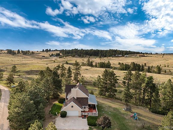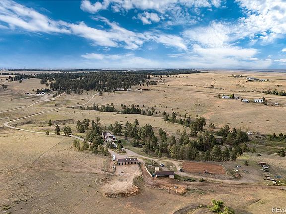 Welcome to this incredible, very private and rare, 63-acre property with tons of topography and personality and NO COVENANTS OR HOA! Partly flat and gently sloping for equine and cattle, valleys with beautiful Ponderosa Pine groves, perfect for shooting, camping...so many options! Country farmhouse style 2-story with partially finished basement. This home has a very traditional feel. Many of the rooms could be considered "flex space" as they could be used in different ways to fit its families' lifestyle. On the main level, you will find a large office with wood burning fireplace. This room could easily be converted into a main floor primary bedroom with an ensuite bath. The dining room has vintage-style hardboard on the walls, large windows, and another wood-burning fireplace. The family room is a cozy place for friends or family to enjoy and the den is a relaxing getaway to read a book or just "be". Enjoy the view out the french doors to the 586 sq. ft covered deck (an additional almost 400 sq. ft uncovered). The kitchen has white cabinetry and appliances including a double oven, tile backsplash, and plenty of Corian countertop space. Around the corner is a small eat-in dining as well as a main floor laundry and mudroom and a 3/4 bathroom. Upstairs, enjoy 6 bedrooms!! All good sized plus a Primary bedroom with 4-piece ensuite. The primary bath is spacious and has a large vanity with double sinks. The large basement is mostly unfinished with the exception to a theatre room. This property also includes a wood 36x60 horse barn with 4-stalls and a tack room, a 48x24 cow barn both have h20 + electric. 160x70 arena pad, chicken coop, and greenhouse. The home has had some updating with luxury vinyl flooring and paint. It is hard to find this type of topography in Elbert County, most are flat, treeless and boring. Bring your animals and bring your stuff and claim your private little slice of heaven!