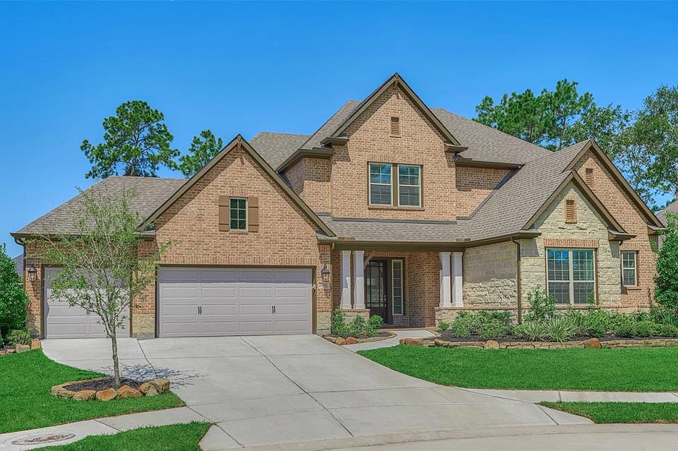Sought-after David Weekley's Cardona plan (former model still like new) on oversized cul-de-sac lot in Falls at Imperial Oaks, easy access to Grand Pkwy, Exxon Campus, The Woodlands. Great neighborhood w/pools, parks, playgrounds, splash pads, dog park, zoned to new Grand Oaks H.S. Well-designed floor plan w/3-car garage, lanai w/fireplace, 4 bedrooms (master & guest on 1st floor), game/media rooms, 3 full & 2 half baths, study, open-concept-living, numerous upgrades & special touches. On-trend finishes in shades of white & gray is sophisticated. Wide-planked, light wood floors. Kitchen has oversized island, clean-lined cabinets w/long linear pulls, stainless steel appliances, light granite, white subway tile b/s. Dining area surrounded by windows, can fit large table. Family room has distinctive slatted wood wall in herringbone pattern, 3 sliding glass doors. Master has unique touches w/tray clg clad in wood, sliding "barn doors" to bath w/his & her vanities, 2 closets, super shower.