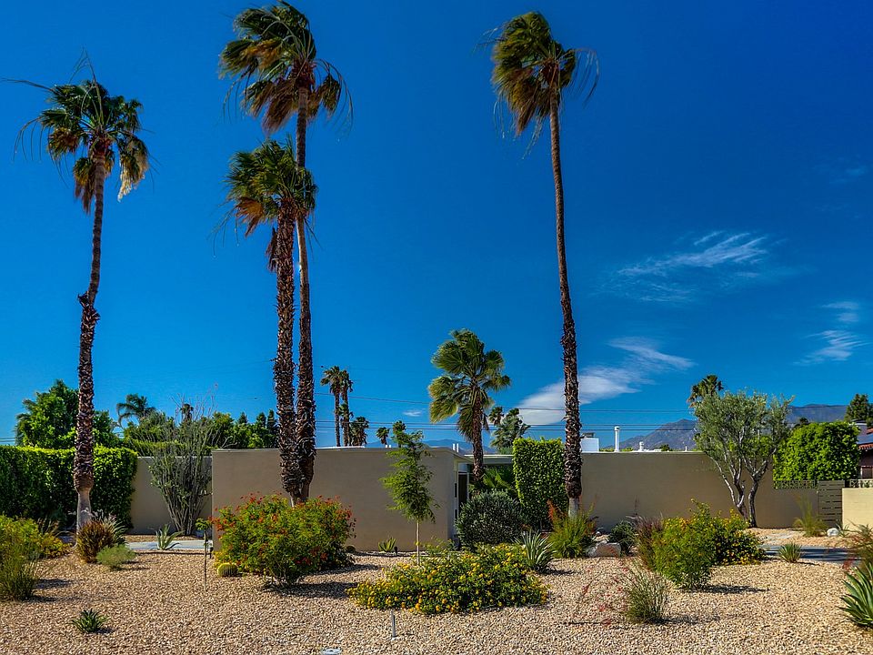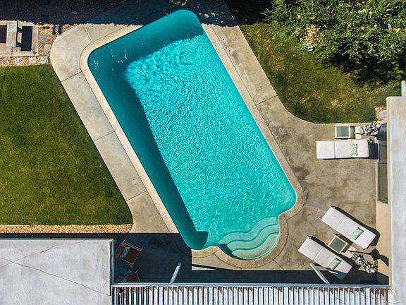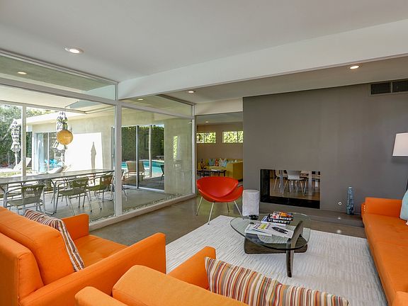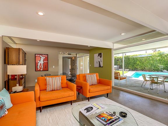 Striking 4 bedroom, 3 bath Mid-century modern home built in 1962 with original pool design, featuring walls of glass onto a large sparkling pool, clerestory windows, raw polished concrete floors throughout, new outside paint and a fabulous porte cochere and circular driveway. The spacious U shaped floor plan features separated dual master suites with direct pool access, patio space and amazing original well maintained bath tiles adding pops of period colors. This home is a decorator''s dream with it'sclean palette, allowing maximum design flexibility.