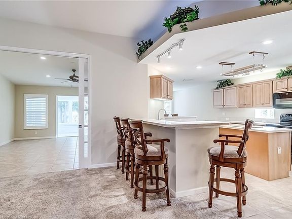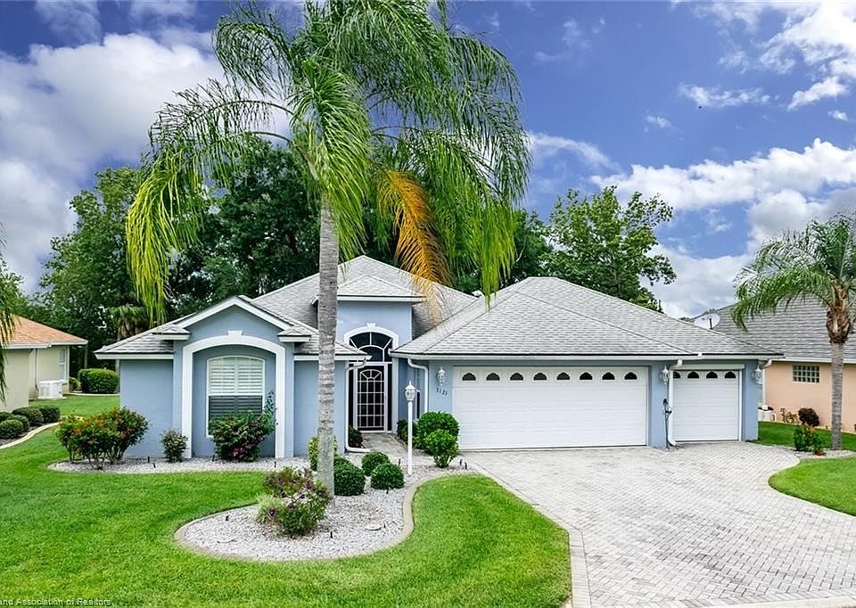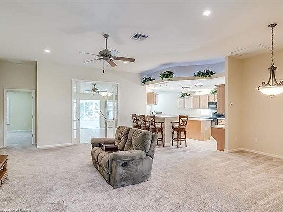 Beautiful 3BD/2.5BA home with a two car garage and a 28x8 golf cart garage over 900 sq ft.total (air conditioned). Plenty of room for cars, workshop and extra storage. This home offers an open floor plan, high ceilings, separate dining room, french doors off the living room that lead to the family room. Spacious kitchen with corian countertops, island with power, solid wood cabinets, high breakfast bar, blocked glass for natural lighting and shelf lighting above the cabinets. Spacious master suite with dual sink high vanity, large shower, walk in closet and a garden tub. There are 2 additional guest bedrooms with a guest bathroom in between. Off the family room is a glassed in lanai that overlooks a pond and is surrounded by trees to provide complete privacy. There are many features that set this home apart: whole house generator, well for irrigation, plantation shutters throughout, Toto high rise toilets, new carpet, entire house carbon water filtration system, and brick paver driveway. This is an active adult community with 2 golf courses, tennis courts, pools, shuffleboard, horseshoes, pickleball, clubs and much to enjoy the Florida lifestyle. Call to schedule a personalized tour of this amazing home.