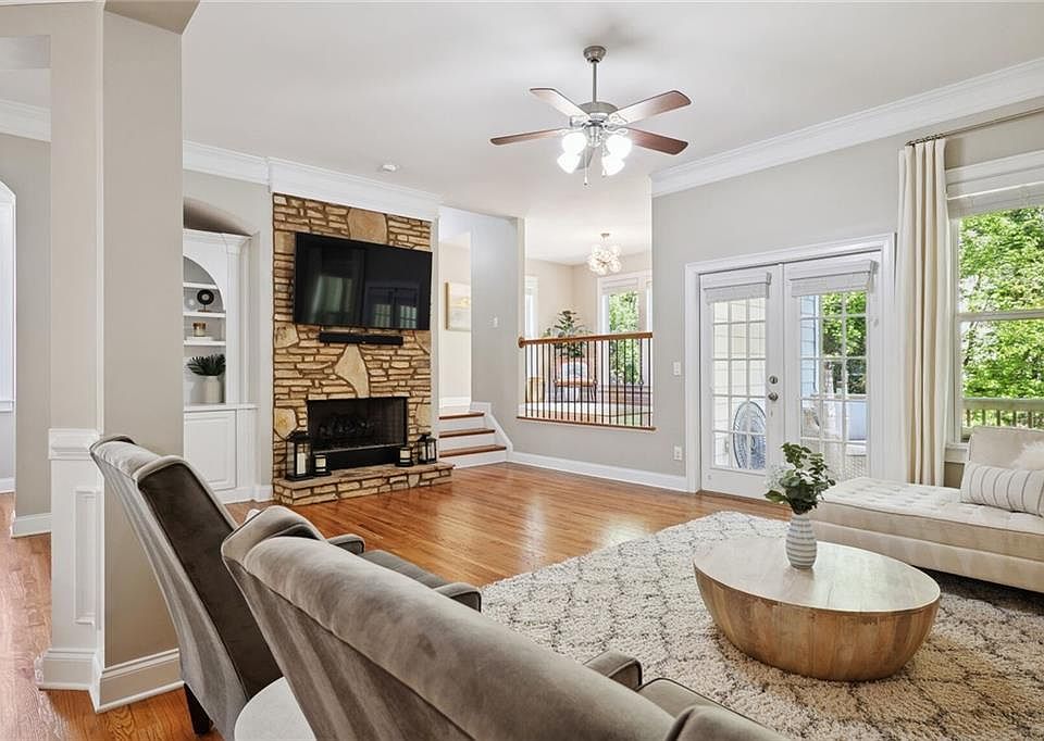 Don’t miss out on this beautifully maintained, end unit Townhome nestled in the sought after neighborhood of Riverwalk at Wildwood! As you walk through the front door into the 2- story foyer, you will be welcomed with gleaming hardwood floors, soaring ceilings and an open floorplan that is flooded with natural light. The kitchen offers elegantly 42" stained cabinetry, ample counter space, a central island with extra storage, large pantry and Stainless-Steel appliances including a refrigerator and gas range. There is also room for a cozy table tucked away inside a sun-filled bay window. Just outside the kitchen you will find a large dining area with a trey ceiling and sophisticated judges paneling. This area opens to a comfortable living room with a cozy fireplace, a stylish built-in bookcase, deep crown molding and a wall of windows with a tree lined view and covered balcony. As you head upstairs there is a unique space filled with natural light that is perfect for a reading lounge, craft area or home office. Upstairs features an oversized master bedroom also with a trey ceiling, sitting area and French doors leading to a private, second balcony. You will also find a large master bathroom with double vanities, a deep whirlpool tub, large glass shower with tile surround and a custom walk-in closet. The upstairs also features a laundry room and a second bedroom with a full bathroom and another walk-in closet. Be sure not to overlook the terrace level with a huge, finished bonus room that can be customized for a media room, home gym, music room or as a second living room to accompany the third bedroom and full bathroom. There are also French doors that lead to a third outdoor area that opens to a fenced, level backyard. To add to the features already mentioned, this home has 2 new HVAC systems, 2 new garage doors, a unique stained glass front door, beautiful inlay entry flooring and upgraded lighting. It is also located just minutes from I-75, I-285 and countless restaurants and entertainment venues like The Battery Atlanta, Truist Park, Cobb Galleria, Cobb Energy Center and The Chattahoochee River. Again, don’t miss out on this beautifully maintained, light filled end unit Townhome located in the sought after neighborhood of Riverwalk at Wildwood!