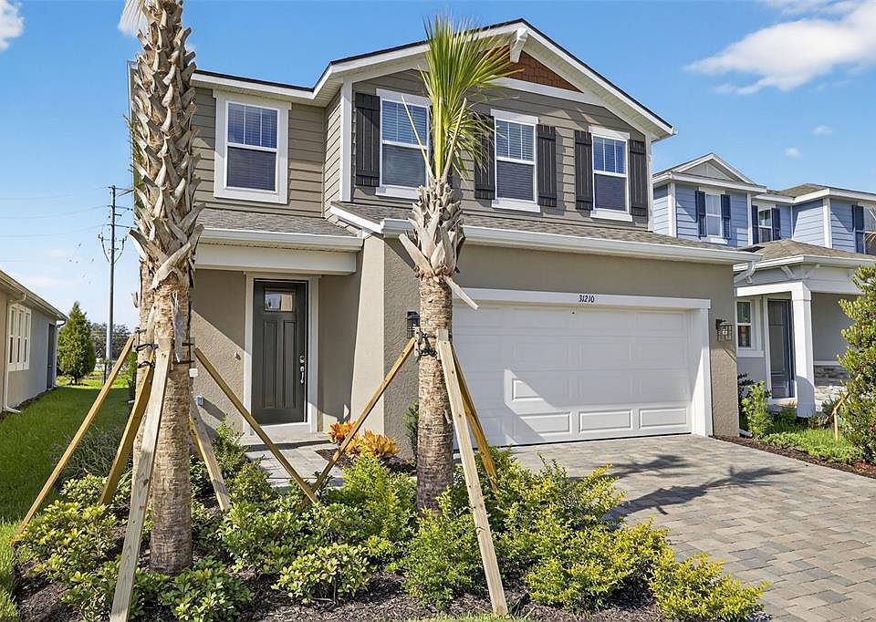 READY NOW!! The Bluespring, a stunning 2,068 sq. ft. home featuring the highly sought-after Craftsman exterior with charming stone accents and a paver driveway, walkway, and entryway. This 3-bedroom, 2.5-bath home offers a perfect balance of style, space, and comfort, and is ready for you to move in today! The open-concept design on the first floor creates a truly spacious feel, with nine-foot ceilings and large sliding glass doors and windows across the back of the home that flood the space with natural light. The sliding doors lead out to a covered paver lanai, an ideal spot for relaxing or entertaining. The kitchen features 42-inch cabinets, elegant quartz countertops, and a convenient corner pantry. The same high-quality cabinetry and countertops are carried throughout the home for a consistent, polished look. Upstairs, you’ll find a large loft area that can serve as a cozy retreat or play area, plus a luxurious owner’s suite that is privately separated from the secondary bedrooms. The en suite bath includes an extended dual-sink raised vanity, a glass-enclosed shower, and a spacious linen closet. The two secondary bedrooms are generous in size and share a full hallway bath. This home is equipped with a smart home package for added convenience, along with lush landscaping that enhances the curb appeal. Located just minutes from Wesley Chapel’s best shopping, dining, and entertainment options, as well as highly rated schools, this home offers the perfect combination of comfort and convenience. Photos, renderings and plans are for illustrative purposes only and should never be relied upon and may vary from the actual home. Pricing, dimensions and features can change at any time without notice or obligation. Photos are from the home and the home staged in certain rooms to show placement and use of space. The furniture and furnishings are not included in the sales price or with the sale of the home.