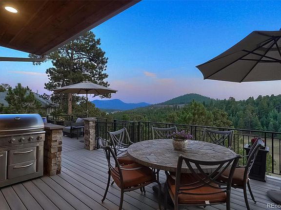 Unbelievable Custom Ranch Home Backs up to over 30 Acres of Open Space w Fantastic Mountain Views. Tradition & Style Exudes from this Beautifully Appointed Estate Nestled amongst Mature Pines & Aspens offering 4 Beds, 6 Baths, Finished Walk-out Basement, 1,400 Bottle Wine Cellar, Abundant Living Space & an Attached Over-sized 844 SqFt 3 Car Garage. Elegant Features of this Remodeled Upgraded Home begin w a Bright Vaulted Living Room enhanced w Wood Beams, Wall of Windows framing Amazing Mountain Views, Gorgeous Hardwood Floors on Main Level, Wet Bar, 2 Fireplaces & Multiple Deck Access; Points for Fabulous indoor/outdoor Entertainment. Walk-out Basement has Expansive Sunlit Family Room w Great Vistas, Gas Fireplace, Wet Bar & an Exquisite Custom Mahogany Wine Room. Step outside onto a Spacious Lower level, no drip Covered Deck; Perfect for Relaxing & Entertaining. Main Level Great Room has Fireplace & Upper Deck access. Gourmet Kitchen has Slab Granite Counters, Huge Quartz Island w Breakfast Bar, SS Appliances includes New Double Ovens, Gas Cooktop, Beautiful Cabinetry, Pantry, Sun filled Breakfast Nook w Access to Deck w gated access to Spiral Staircase connecting Upper & Lower Maintenance Free Decks. Spacious Main Level Office has Built-ins & Desk. Master Retreat w Sitting Area & Walk-in Closets. Luxurious 5-Piece Master Bath has Freestanding Air Jet Soaking Tub, Large Steam Shower, Water Closet, Tile Floor. 3 more Sun Lit Beds in Lower Level all w Beautiful en Suite Baths & Bonus Room, Ideal as a Workout Room. Main Level has Large Laundry w Cabinets, Counter Space & Utility Sink, Powder Room & Mud Room. New Stucco Exterior. Xeriscape Landscaping & Hardwired Landscape Lighting. 3 Flagstone Patios in Back, 1 w Gas Firepit, lower has Pergola, & 3rd near deck has 50 Amp Electrical Panel (supports future hot tub). Only a Few Minutes to Shopping, Dining & Trails. Close to Golf & Evergreen Lake. Just 30 minutes to Denver. See Virtual 3-D & Aerial Tours.