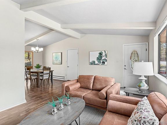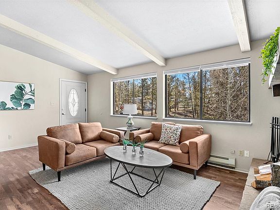 Get ready to fall in love! Looking for a mountain home that's centrally located, has community water and sewer, no HOA, a manageable flat, south facing lot, RV parking, daily visits from a family of deer, a commutable distance to Denver, paved roads, all above grade square footage, walkable to shopping, and 5 minutes from an RTD bus stop? Well, you have found it! So many great things about this property you don't want to miss it.