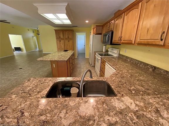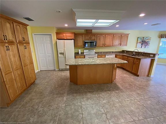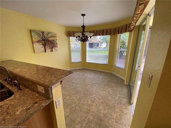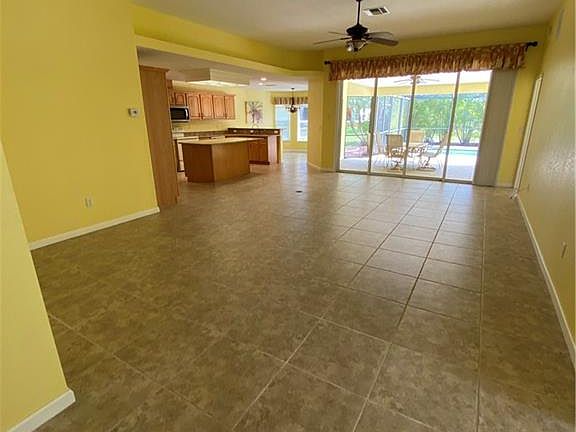 Pool Home in Highlands Ridge South Course. Enter through the screened front entrance to an open floor plan with a view through sliding doors to the pool. The kitchen has quartz counters. The center island provides extra work space. There is a breakfast nook that opens to the patio and salt water pool. Porcelain tile flooring throughout. Owners suite with tray ceiling, sliding door to the pool, and bath with double sinks and large walk-in shower. The guest suite is located in the front of the home with a pocket door leading to the guest bath and bedroom. The third bedroom / den is off the living room with double pocket doors. As you enter the living room, to the left is the dining room area. The in-house utility room also has a sink and a large closet with built-in shelving