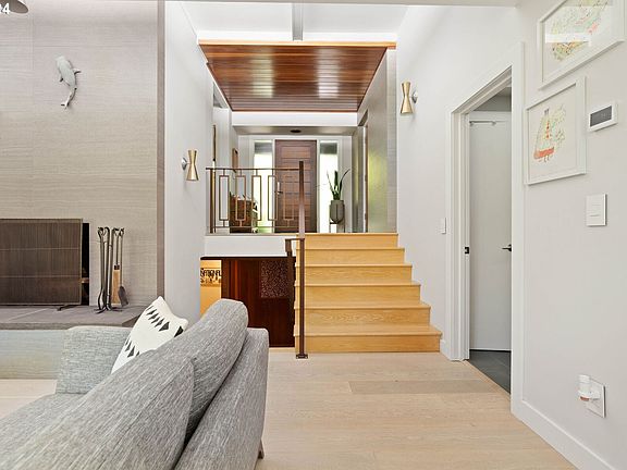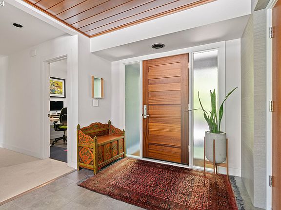 This Arnold Creek mid-century modern home is a truly unique expression of architectural design & thoughtful contemporary updates, offering a blend of elegance & functionality. Clean lines, original details & open spaces make this home an absolute dream! Floor to ceiling windows flood the interior with natural light, enhancing the spacious feel & connecting indoor spaces with the stunning outdoor landscape. Vaulted beamed ceilings, high-end European Oak floors, original woodwork, a wood burning fireplace & built-ins add drama & richness with high design. Spacious formal dining room & open concept kitchen with Quartz countertops, large island, stainless steel appliances, & custom Walnut cabinetry are perfect for entertaining & modern living. Primary bedroom suite includes a walk-in closet & a spa-inspired bathroom with a large step-in shower & soaking tub. Basement level features a family room, guest bedroom space, updated bath & sauna for additional living & relaxation areas. The upper level bedroom/office/theater room has a full bath & amazing views of the backyard. Energy efficient updates include: double pane windows, radiant heat floors, new mini splits, low flow toilets & a passive solar design utilizing natural elements for heating & cooling, reducing energy costs & environmental impact over time. Other updates include: whole house built-in speaker system, central air, new hot water heaters & updated electrical. Nearly half an acre of private, lushly landscaped designer garden space. Ornamental trees, sprinkler system, landscape lighting, covered patio & new deck provide spaces designed for relaxation & entertainment. You will have plenty of parking for your guests with a 2 car attached garage, extra wide & deep driveway & an additional parking pad. This home combines timeless mid-century modern architecture with thoughtful updates & energy-efficient features, creating a stunning & comfortable living environment ready for its new owner to enjoy. [Home Energy Score = 4. HES Report at https://rpt.greenbuildingregistry.com/hes/OR10229506]