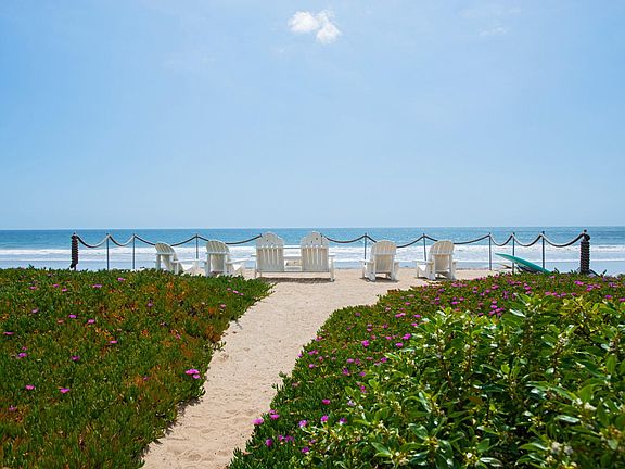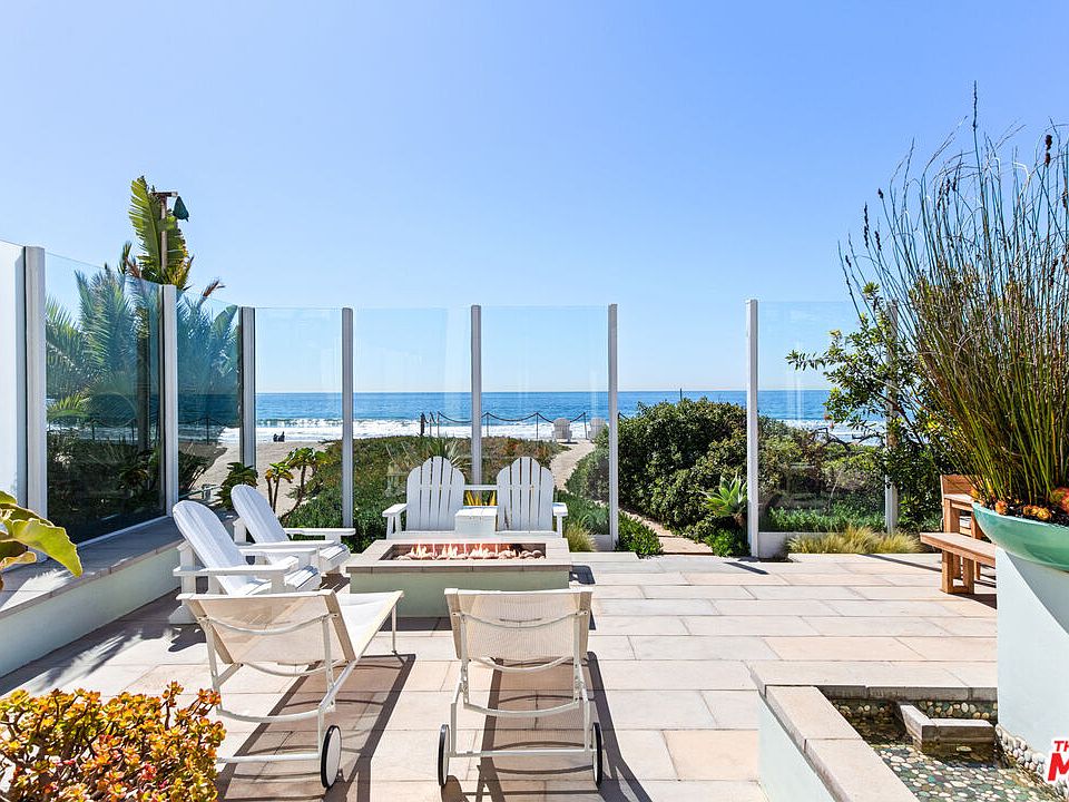 Perfect for entertaining, bright stylish contemporary with ocean views. Sunken living room/bar/den has high ceilings, wraparound windows, dramatic rock wall fireplace. Super-cool kitchen with bright aqua cabinets, stainless appliances, center island, multiple sinks, 4-ovens, built-in breakfast area. Main floor powder room and en-suite maid's/guest. Wide, skylit staircase to three bedrooms, including stunning ocean-view master with floor-to-ceiling glass onto a private deck, rock-wall fireplace, sculptural bed, office/seating area, vast bath and closet with built-ins. One bdrm has mini-kitchen, other currently a mirrored gym. Lower level large suite/rumpus room with bath & nearby laundry room. Laundry chute/dumbwaiter serves all 3-levels. Below detached 3-car garage is one-bdrm, 2-bath guest house with kitchenette and courtyard. Main ocean-view patio has ample seating, firepit, built-in barbecue, beach shower, steps to sandy seating area above the waves.