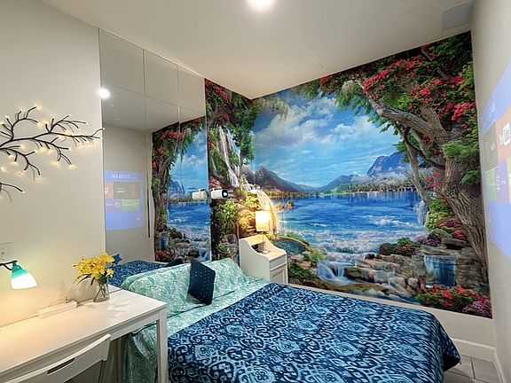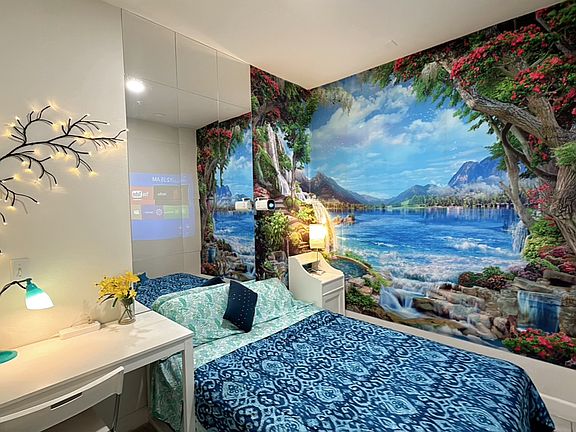 With an Android 4k Projector, desk, Mirror, portable fan in your own room,