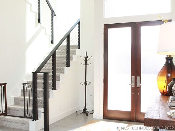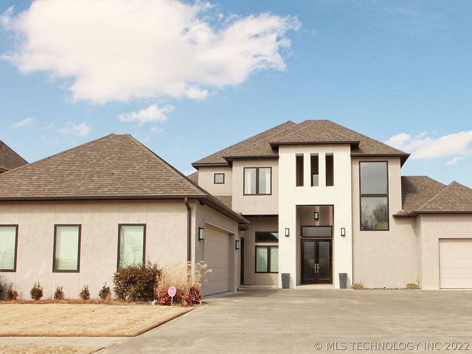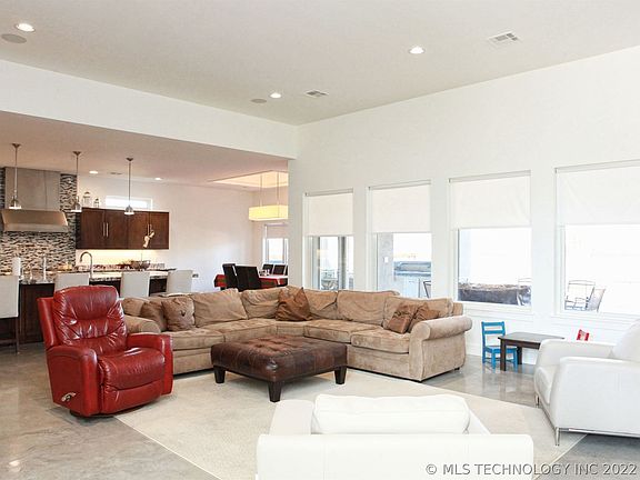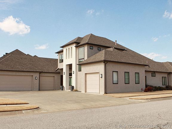 Gorgeous contemporary home in Jenks SE schools! This home is in a gated community with neighborhood pool. Large open rooms and Picture windows. 3 bedrooms down with heated floors and steam shower in master. 4 car garage and outdoor kitchen- must see!