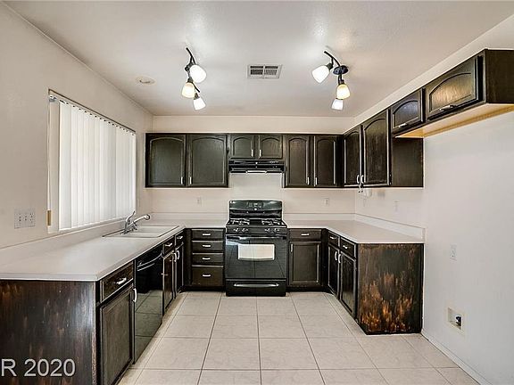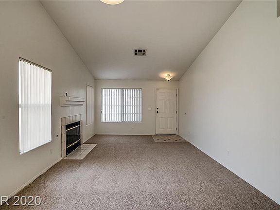 This North Las Vegas home offers a fireplace, a covered patio, and a two-car garage.