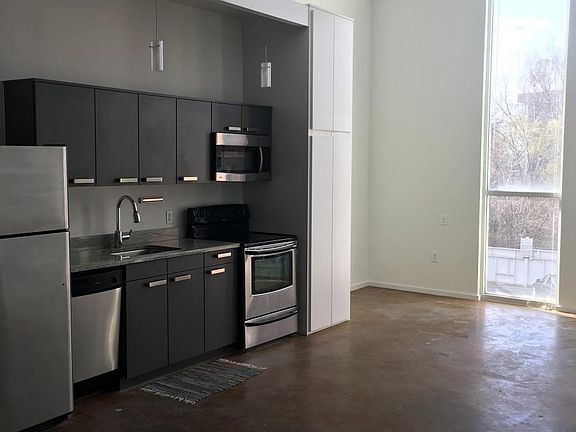 Stunning two-story loft in NoDa. Very modern located in the heart of NoDa. Open floor plan with spiral staircase to loft bedroom. 20 foot floor to ceiling windows. Full bathroom upstairs and half-bath downstairs. Stainless steel refrigerator, dishwasher, microwave, and oven included. Premium Bosch washer and dryer located inside unit. Huge 10' closet in bedroom. European cabinetry and all chrome fixtures. Concrete and hardwood floors throughout. Balcony large enough for table and chairs. Walking distance to all of NoDa and one block from light rail station. Rent includes washer/dryer, water/sewer, and parking. Renter pays for background check and credit check. Smoke-free unit. Small dogs or cats must be approved.