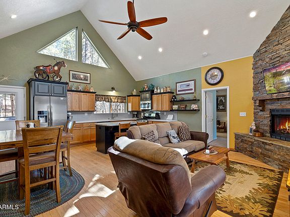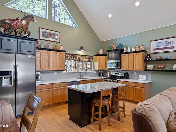 Do not miss this fully furnished, charming Pinetop cabin, tucked away to provide you an abundance of privacy & close enough to enjoy all the city's amenities. It is the perfect retreat for those seeking rustic elegance & modern comfort. Offering 1,174 square feet of inviting living space, this home provides you with 2 primary bedroom suites & features an open floorplan concept with soaring vaulted ceilings, a floor to ceiling custom stone fireplace, creating a warm & cozy atmosphere. The spacious kitchen is designed for both style & function, with quartz & granite counters, a granite sink, sleek S/S appliances, updated cabinetry, & an island with bar seating. The primary suite is a true sanctuary, boasting an ensuite with a jetted tub, walk-in shower, & generous space to unwind. A well-appointed guest bedroom that doubles as a secondary primary suite to ensure comfort for visitors.