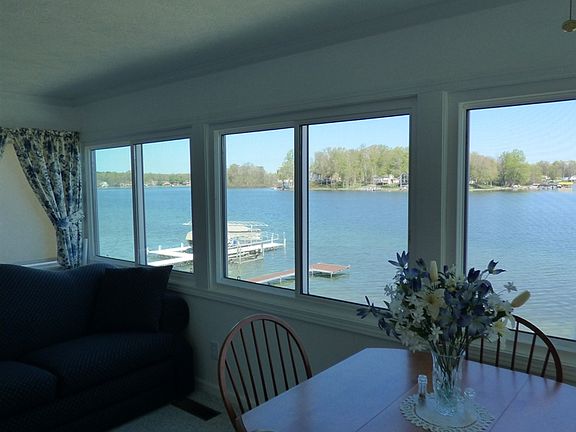 Updated Magician Lake home in the Currans Beach Subdivision. Panoramic full lake views from the lovely front 4-seasons room and the large deck lakeside. The kitchen is bright and white with ceramic tile flooring. Spacious living room, gas fireplace, and french doors into the 4-seasons room. Nice entertaining open area. Perfect for lake living. A tub enclosure, storage space, and a warm color completes the bathroom. With 52' of private beach frontage, and a back lot with a detached garage, you have terrific outdoor space. The walkout level is partially finished and includes the mechanicals. Central air, gas furnace and sewer. This lake home is very neat, manageable, with low maintenance, and affordable. All furnishings included. Beautifully landscaped.Magician Lake is a premier 528 acre all sport lake in the resort area of Sister Lakes, Michigan. Enjoy summers with wake and paddle boarding, pontoon excursions at sunset, and winter enjoyment with snowmobiling or ice fishing. Fresh produce stands, winery tours, and great golf courses are all just around the corner.
