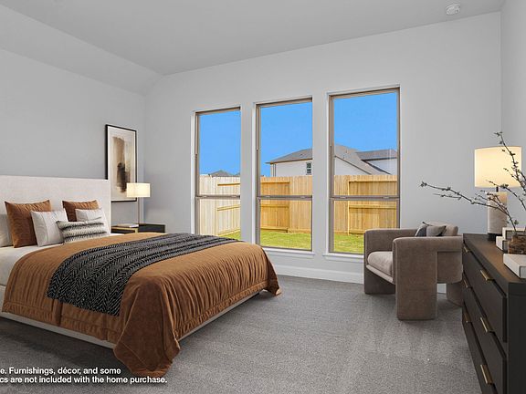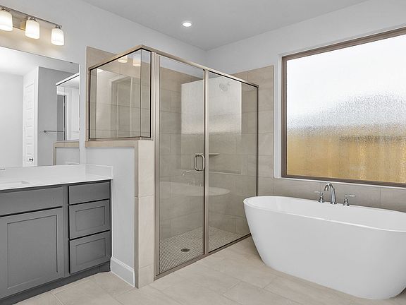 Home office with French doors set at entry with 11-foot ceiling. Open kitchen offers center island, 5-burner gas cooktop and corner walk-in pantry. Dining area opens to spacious family room with wall of windows. Private primary suite includes bedroom with wall of windows. Dual vanity, freestanding tub, separate glass-enclosed shower and large walk-in closet in primary bath. Abundant closet space and natural light throughout. Covered backyard patio. Mud room off two-car garage. Representative Images. Features and specifications may vary by community.