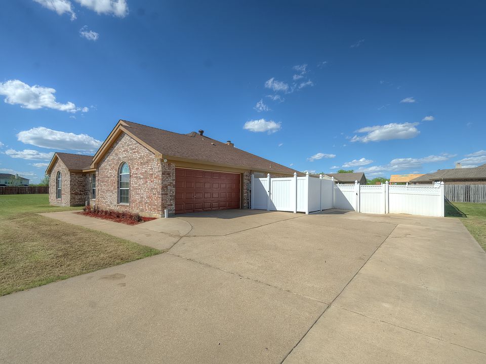 Great home on a large corner lot that is just under an acre with room to spread out on both sides. With four bedrooms, or three bedrooms with a study, the layout of this home offers many ways to use the space. Living and dining areas are open for entertaining and the kitchen has newer appliances. Bedrooms are separate and offer privacy. This home has many extras including built in speakers, built in safe in primary bedroom, sound system wiring, and vinyl fencing. The large covered back patio is a great place to relax.