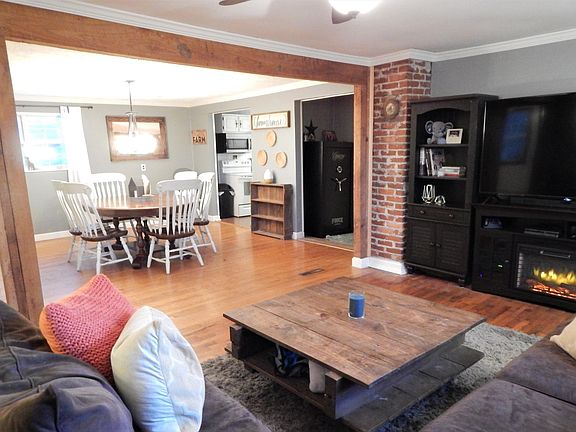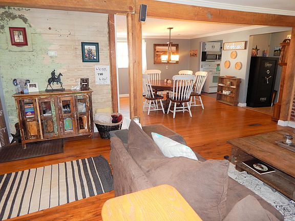 Welcome to the country! This updated farm house has a barn, storage building and chicken coupe. Hardwood floors, split bedrooms, sunroom, large back deck and basement cellar with tons of storage. New sheetrock, baseboards and crown molding have been installed in living room, dining room and master bedroom. Master has closet organizer and access to private deck. Back pasture has electric fencing and barn. Large storage shed with workshop area. Side yards has large firepit and large garden area.