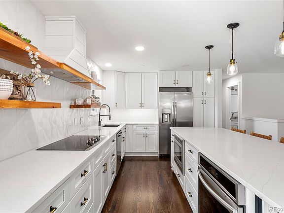 Discover the charm of this fully renovated ranch-style house nestled in the desirable Littleton School District. As you step into this beautifully modernized home, experience the warm welcome of an open floor plan that seamlessly connects you to a stunning kitchen, perfect for hosting and creating lasting memories. The main living space is adorned with a wood-burning fireplace and expansive windows that fill the room with natural light, creating a bright and inviting atmosphere. Enjoy the addition of a sunroom leading to a backyard patio, complete with panoramic mountain views on clear days. The master suite offers a generous closet space and a custom-designed 5-piece bathroom. Venture downstairs to find an entertainment area, two additional large bedrooms, and a tastefully renovated bathroom. Interior storage is provided in the oversized laundry/utility room. Recent upgrades include new paint, flooring, and carpet throughout, state-of-the-art kitchen appliances, a newly installed roof, new sewer, and updated siding on the sunroom. The property also comes complete a newly paved driveway and extra parking space in the gated side yard. Walkable to deKoevend Park and the Streets at SouthGlenn providing convenience and an invitation to get outdoors.