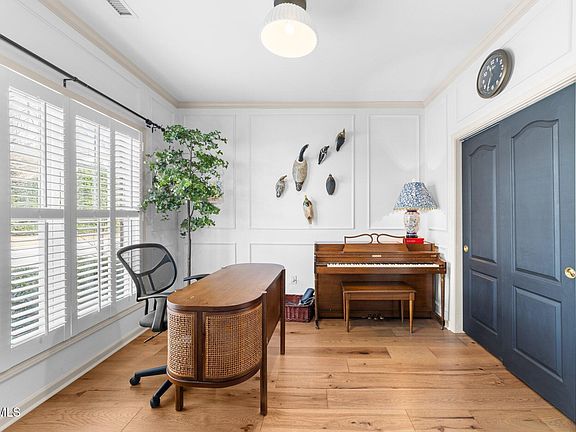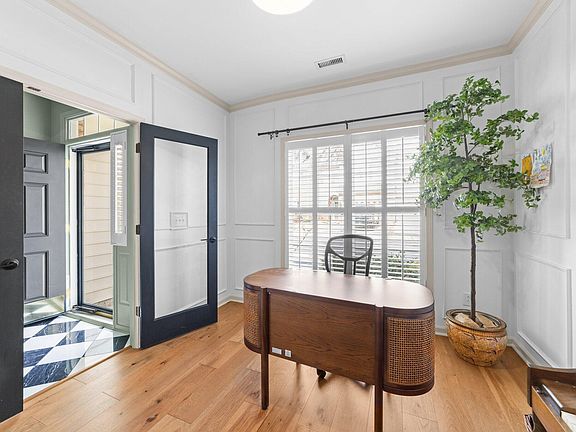 Nestled in the sought-after Calloway Green community of Wakefield, this beautifully designed 3-bedroom, 2.5-bath townhome offers 2,369 square feet and a 1-car garage. Gorgeous engineered hardwood floors extend throughout, creating an elegant and allergy-friendly living space—only the foyer and primary bath feature different flooring. The bright kitchen is a chef's delight, showcasing quartz countertops, recessed lighting, a tile backsplash, crisp white cabinetry with under-cabinet lighting, stainless steel appliances, an island with barstool seating, and elegant crown molding with wainscoting. Retreat to the primary suite, where a vaulted ceiling, ceiling fan, and an accent wall color create a serene atmosphere. The spa-like primary bath is an absolute showstopper with marble flooring, custom wainscoting, recessed lighting, a jetted tub, a separate seamless glass shower, a custom furniture-style dual vanity with granite countertops, and an elegantly framed mirror with stylish upgraded lighting. The family room is warm and welcoming, featuring crown molding, a corner gas log fireplace with dentil trim detail, a recessed arched niche above the fireplace, and updated lighting. The third-floor bonus room is a versatile space with vaulted ceilings and skylights, ideal for a media room, playroom, or additional office. The spacious secondary bedrooms both feature vaulted ceilings, and one offers access to a private balcony—a perfect spot to unwind. Custom trimwork, crown molding, and plantation shutters add timeless charm, while the home is pre-wired for security, offering future peace of mind. A true highlight is the home office, featuring decorative wall detail trim and updated lighting, making it ideal for remote work. The brick front exterior features classic soldier course brickwork above the windows and garage. A one-car garage with a two-car parking pad and a stamped concrete border design provides plenty of parking as well as additional parking within the community. Conveniently located near shopping, dining, schools, and more, this townhome provides easy access to all that Wakefield has to offer. With plenty of guest parking and a beautifully maintained community, this home is a true gem. Don't miss out on this stunning townhome—schedule your showing today!