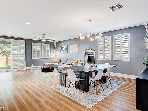 Situated on one of Inspirada's premier avenues lies a contemporary 3-bedroom, 2-bathroom gem with a den and a 2-car garage. Upon entry, a sophisticated walnut showcase invites you to relive your most treasured moments. At its core, a gourmet chef's kitchen adorned with luminous Calacatta Quartz, cutting-edge appliances, and vibrant tones stands out. The open-concept layout, paired with sleek vinyl flooring, artisanal finishes, and mood-enhancing lighting, promises impeccable hosting experiences. Superior, energy-efficient windows shield against the Vegas warmth, while elegant Plantation shutters offer discretion. Nestled on a corner plot, this home unfurls a tranquil backyard retreat featuring a sheltered patio, lush turf, and stylish pavers. Immerse yourself in the nearby scenic trails, parks, and elite schools in this epitome of modern luxury and ease.