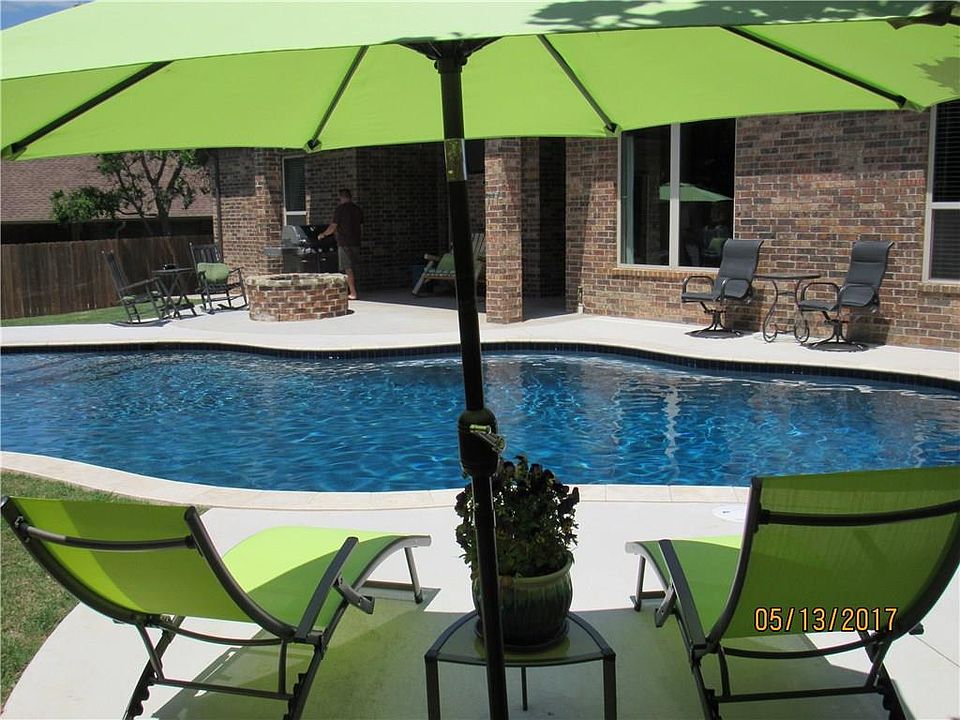 Beautiful home w/ all the amenities including a SWIMMING POOL so you can relax & unwind in your very own paradise. Located in the Centennial at Iron Horse Ranch neighborhood. Granite countertops, under sink mounts throughout, large kitchen island, wood floors in living room, crown molding throughout, with custom woodwork. Amazing giant master closet & large master bathroom which includes a walk-in shower and jetted tub. All other bedrooms have walk-in closets. 3 car garage is large enough to park 4 cars & includes a storm shelter. Relax while sitting on the back porch next to a gas fire pit looking at nothing but trees and the stars above. To top it off, entertain your friends' poolside next to an amazing salt water pool with a LED light show. Pool has LED lights, sun deck with LED bubbler, and two swim benches. Don't miss your chance to live in luxury and relaxation!! **Bonus room space of 750 sf above garage was allotted by builder - but not added. Could easily be added.