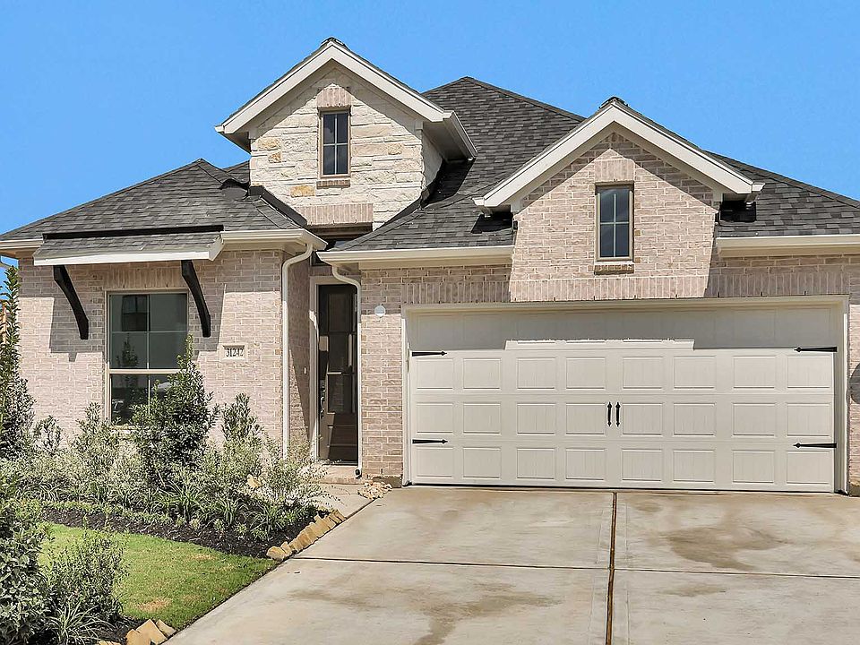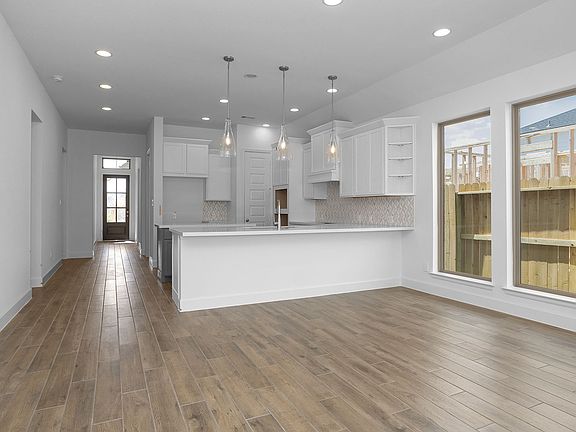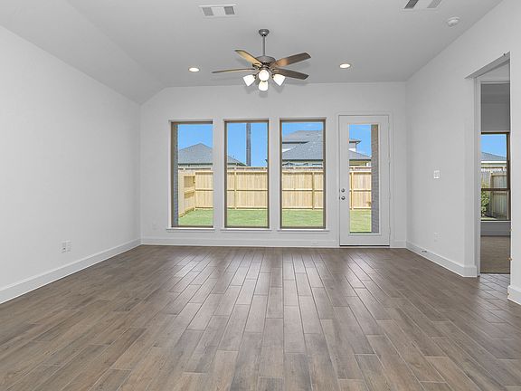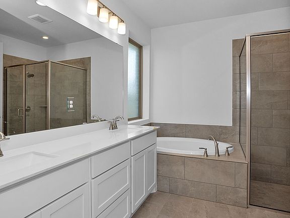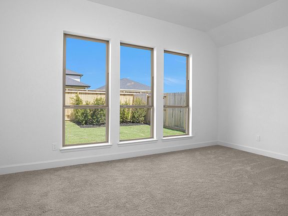 Entry welcomes you with a 12-foot ceiling. Open kitchen offers a center island, 5-burner gas cooktop and spacious pantry. Dining area flows into open family room with wall of windows. Secluded primary suite includes primary bath with dual vanities, garden tub, separate glass-enclosed shower and a large walk-in closet. Abundant closet space in the secondary bedrooms. Covered backyard patio. Mud room off the two-car garage. Representative Images. Features and specifications may vary by community.