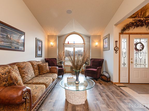 Amazing county setting close to town with 3.52 acres situated on a private lake stocked with fish and ideal for kayaking in the summer and ice skating in the winter. This grand two story home features a sprawling main floor. The main floor offers a living room with lots of natural light, a family room with gas fireplace and surround sound located off the open kitchen perfect for entertaining, a formal dining room, a dedicated office, 3/4 bathroom, and a separate laundry room. Off the main floor are two separate exits to the back concrete patio. The upper level has a full bathroom, 3 nice sized bedrooms which includes a large master suite with a walkout to a private deck, walk-in closet, bathroom with double sinks, shower, and whirlpool tub. Also on the upper level is a bonus room perfect for a game/entertainment area or could be a large 4th bedroom. This home has ample amount of garage space which includes the heated 3 stall attached garage and another 26' x 30' detached garage. Additional features include newer carpet, dual zone heating, new roof in 2018, underground sprinklers drawing water from the lake, small fenced in area, nicely landscaped yard, and a concrete patio. This setting is beautiful, call an agent today for a private showing.