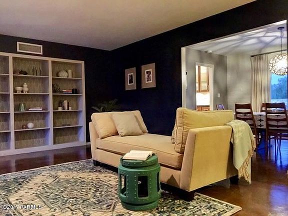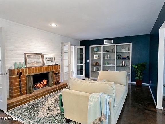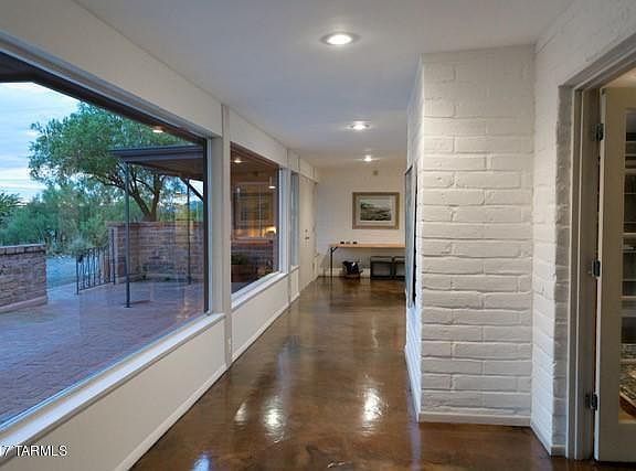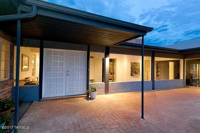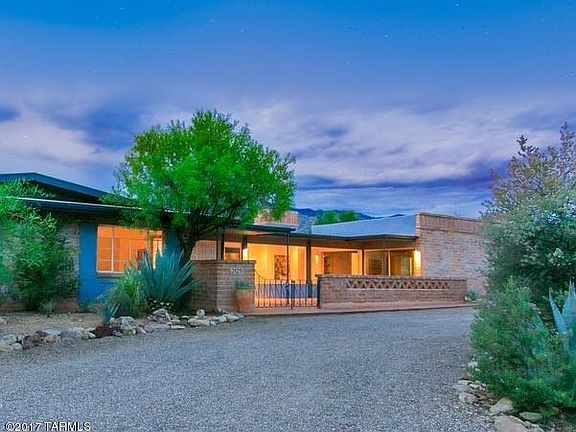 Perfectly situated to capture the panoramic Catalina Foothills, this midcentury territorial is modern,charming and spacious. Enter through a gallery style foyer to an open, updated kitchen with access and views to the newly remodeled pebbletec pool, firepit and outdoor kitchen. The formal dining room is adjacent to a separate den with French doors, built-in bookcases, and the first of two wood-burning fireplaces. A large living room beyond has beamed ceilings, a second fireplace and private patio with even more views, a fountain and rusted metalwork details. A centrally located office could also be used as a bonus playroom and has a closet for additional storage. Four bedrooms, including two master suites with a split floor plan, and three and a half baths, provide ample space and flexibility. The East master suite features a full bath with dual sinks and a jetted soaking tub, and the walk-in closet is equipped with a second laundry. The polished concrete floors, custom counters and exposed adobe all make this home a wonderful specimen of classic Tucson style.