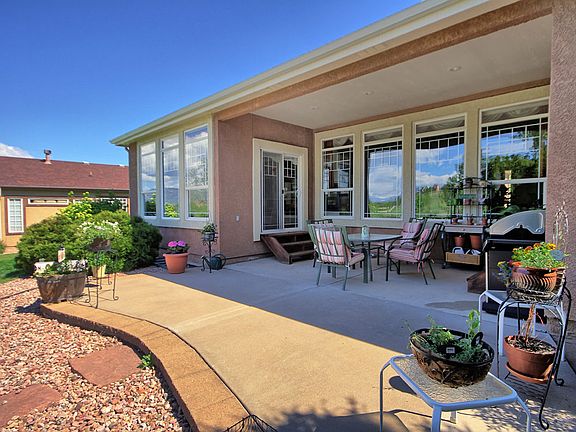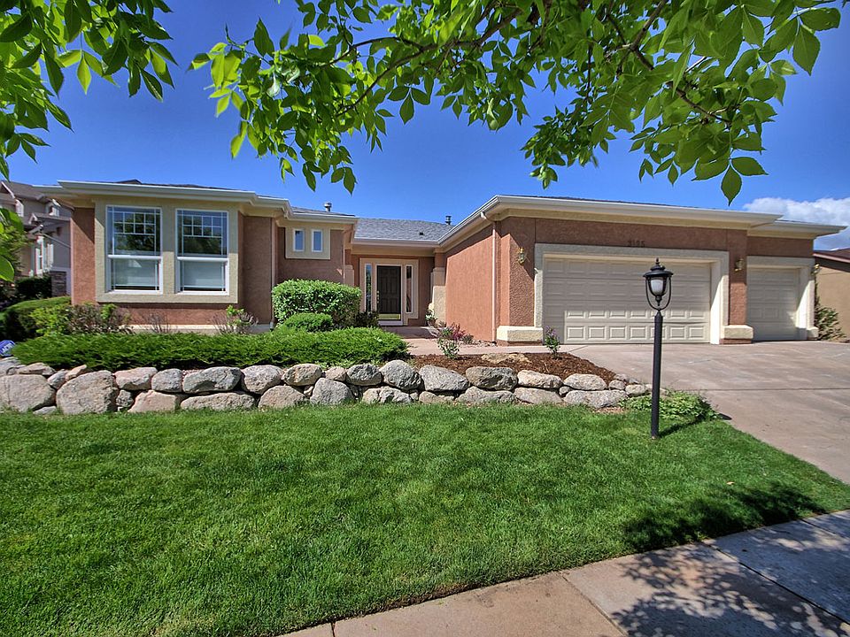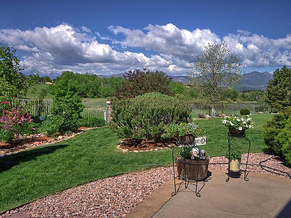 You will love this 5 bed/3 bath Pine Creek ranch level home. Main level living at its best! Unobstructed Pikes Peak views!! Main level master and two additional main level bedrooms and main level laundry. A wonderful floorplan with formal dining room featuring a bay window, expansive kitchen with separate eating area with walkout to the patio, a great living room with three sided fireplace and views, views! Upgrades include hardwood floors, tile counters, wet bar, central air and more! This is a great home in a great area! The master bedroom features walkout to the covered patio and a 5 piece master bathroom with walk-in closet. The basement has a great family room area with built-ins and a cozy fireplace. The recreation room in the basement features a pool table that is included, game table area and a large wet bar. The backyard feels more like a park setting with mature trees and plants and open space behind the home. Located on a 1/4 acre corner lot just steps away from the Pine Creek Golf Club. Conveniently located close to D-20 schools, shopping, medical facilities, restaurants, hiking and biking trails and a new large outdoor sports park that is being completed in the area. Prepare to be impressed!!