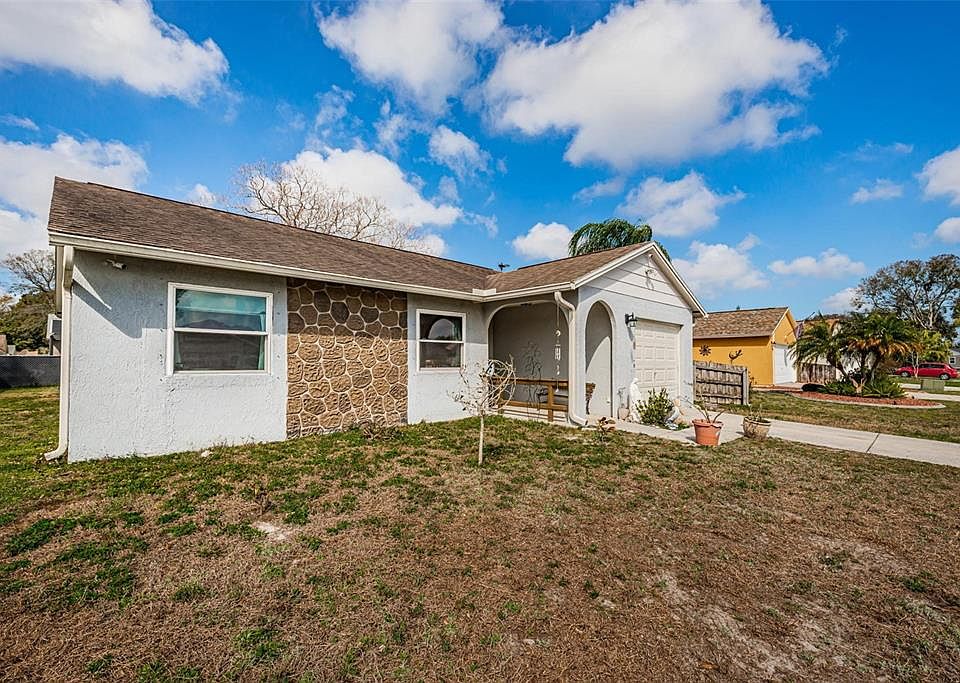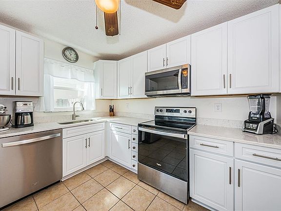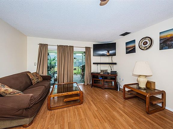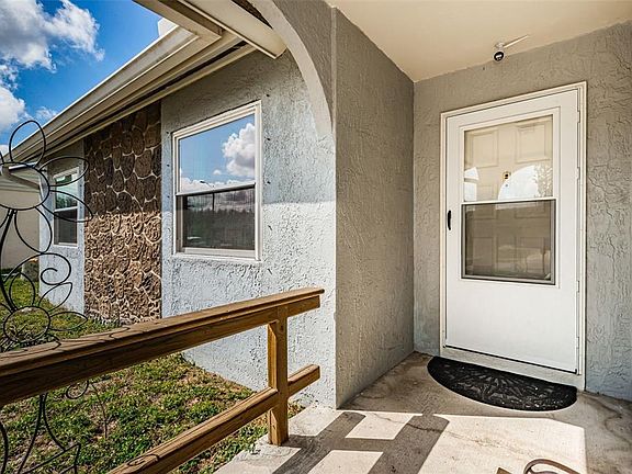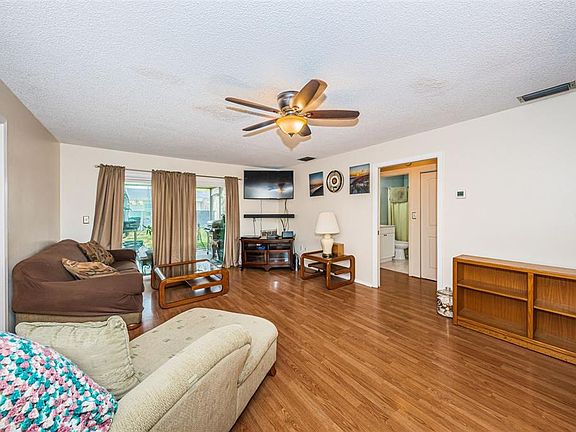 LOCATION - LOCATION - LOCATION ~ AFFORDABLE ~ ONE STORY ~ MOVE IN READY ~ GREAT SCHOOLS ~ Do not miss this CHARMING REMODELED 2 BEDROOM, 2 BATH HOME with a 1 CAR GARAGE in an EXCELLENT LOCATION. The OPEN, AIRY LIVING ROOM and DINING ROOM is highlighted with LAMINATE FLOORS, ALL NEW WINDOWS THROUGHOUT THE HOME ALONG WITH A NEW SLIDING GLASS DOOR to the SCREENED IN OUTDOOR LANAI from the living room. The BEAUTIFULLY REMODELED KITCHEN is LIGHT AND BRIGHT featuring STAINLESS STEEL APPLIANCES, CUSTOM CABINETS, QUARTZ COUNTERTOPS, CERAMIC TILE FLOORS, CLOSET PANTRY, NEWLY PAINTED WALLS with space for a kitchen table too. The SPLIT FLOOR PLAN gives privacy for each bedroom. The owner's suite is large and overlooks the backyard. The owners suite bath features a shower/tub combination, pedestal sink with linen closet storage. The second bedroom is conveniently located to the second bathroom. The washer and dryer are BRAND NEW and are included. Additional upgrades to this home include all new windows (2017), HVAC (2018), Hot Water Heater (2019), ceiling fans, new exterior paint (2018), Gutters, Night Owl Camera Security system conveys, Roof (2011) with a PARTIALLY FENCED IN BACKYARD AND A PEEK A BOO VIEW OF THE POND ACROSS THE STREET. NO HOA, NO CDD FEES, MUST SEE TO APPRECIATE.