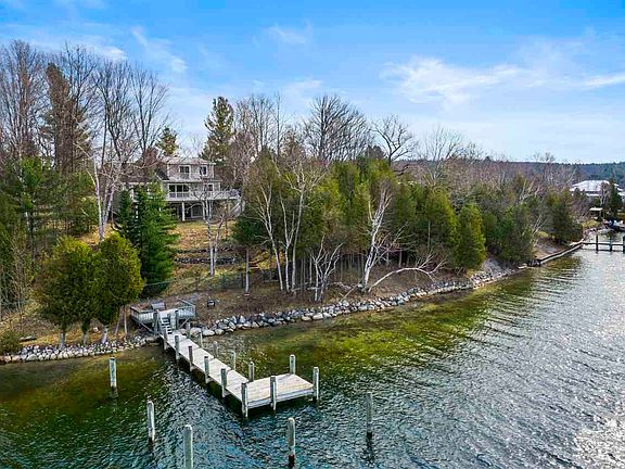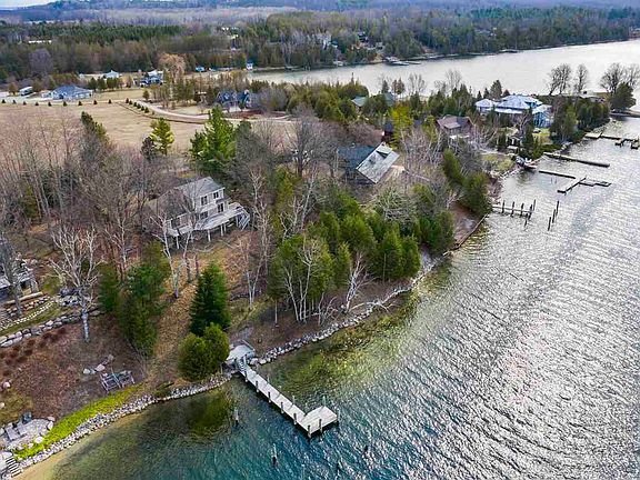With exceptional views overlooking the South Arm, this enchanting and cozy home sits on a quiet paved road just before the Ironton Ferry. The property is a beautiful, spacious lot that slopes gradually down to the water. This very well-built and maintained home has five bedrooms and 3.5 baths with a main floor master suite, while one of the two upper-level bedrooms has its own private balcony. A lower-level walkout has additional living space with a wet bar and its own fireplace. Take in the view of Lake Charlevoix on the expansive deck for summertime enjoyment. The exceptional permanent dock allows for large boats up to 60 feet in the protected deep water. With the way that the dock is laid out, it's a great opportunity for a family with a small fleet of boats (a boaters paradise). When it comes to property size, you can really feel the difference on a 200' lot. Did I mention how close this is to the Landings, a landmark restaurant with great food. Living here, you can have it all!