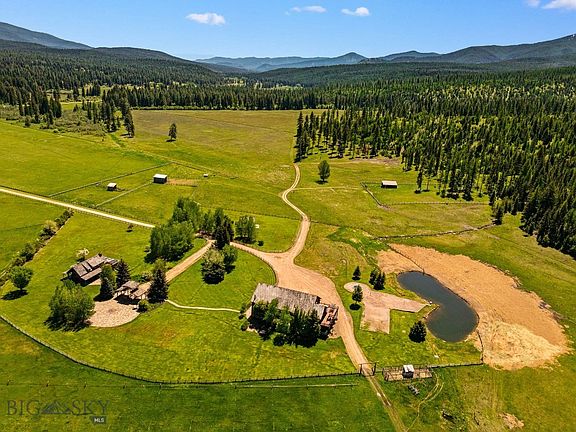 acres, contiguous to Lolo National Forest for about a mile, boast breathtaking views, unparalleled privacy, and almost two miles of fishable Ninemile Creek frontage, creating a quintessential Montana retreat. Acreage ranges from 170± acres of timbered slopes to creek bottom, irrigated lawns, and about 130 acres of irrigated hay meadows. Wildlife traipsing through includes whitetail deer, elk, turkeys, grouse, sandhill cranes, and the occasional wolf. The stunning landscape is only bested by the improvements, including a 3 bedroom/2.5 bathroom 2,970± SF main home, 902± SF log guest cabin, a 12,000± SF barn/recreation center that sleeps 22 that includes a shop and vehicle storage, a rustic cabin with an outhouse, two pole-frame storage buildings, and a sporting clays course.